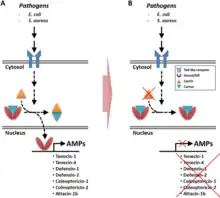 - ↑ Jo YH, Kim YJ, Park KB, Seong JH, Kim SG, Park S, et al. (April 2017). "TmCactin plays an important role in Gram-negative and -positive bacterial infection by regulating expression of 7 AMP genes in Tenebrio molitor". Scientific Reports. 7 (1): 46459. Bibcode:2017NatSR...746459J. doi:10.1038/srep46459. PMC 5394457. PMID 28418029.