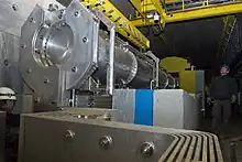 Approval for the CNGS project was signed by the CERN Council in December 1999,[2] with civil engineering on the project starting the following September.[3] Construction of the tunnels and service caverns was completed in mid-2004, with equipment installation completed in summer 2005 and commissioning being carried out throughout spring 2006. The first proton beam was sent to the target on 11 July 2006, with the CNGS facility being approved for physics operations on 18 August 2006. CNGS ceased operation in 2012. The tunnel was then repurposed for the AWAKE experiment, which became operational in 2016.