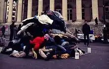 Early December, COMBO collaborated with other street artists and realized a pop-up installation[7] place de la Bourse in the 2nd arrondissement, minutes away from AFP's headquarters, to pay a tribute to the 162 homeless persons who died in the street over the six previous months.