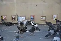 In September 2012, he set up an exhibit for pigeons[6] right in front of the Centre Georges Pompidou in Paris, and hung about twenty of the most famous art pieces - that he would obviously have hijacked first - at eyes-height of the birds.