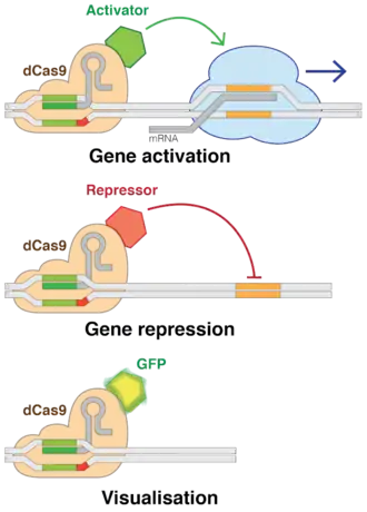- ↑ Dominguez AA, Lim WA, Qi LS (January 2016). "Beyond editing: repurposing CRISPR-Cas9 for precision genome regulation and interrogation". Nature Reviews. Molecular Cell Biology. 17 (1): 5–15. doi:10.1038/nrm.2015.2. PMC 4922510. PMID 26670017.