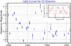 Light curves for CX Draconis. The main plot, from Hipparcos data,[1] shows the long-term variability. The inset plot, from TESS data,[2] shows how the brightness changes of short timescales.