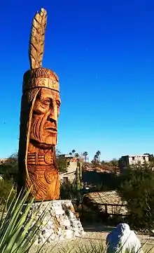 A later addition to the site is that of the Waokiye, or "traditional helper" in the Lakota language. Waokiye is the twenty-seventh sculpture in a series of 74 giant Native American heads, collectively known as the Trail of the Whispering Giants, carved during a twenty-one-year period by artist Peter Wolf Toth. The 43-foot sculpture was carved with the use of power tools from a section of a 45-ton (46 metric ton) giant sequoia log.[22] The 750-year-old tree, which originally stood in Sequoia National Park, had been felled by lightning in the mid-1950s. All but the feather in Waokiye's headband was carved from the log. The feather was carved from an incense cedar from the nearby mountain community of Idyllwild. The statue was unveiled on May 20, 1978; it was repaired and rededicated by Toth on February 21, 2009.[23] At present, it is the only one of the sculptures left in California.[24]