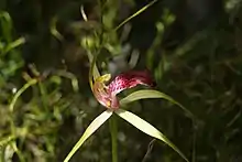 Caladenia ambusta, commonly known as the Boranup spider orchid,[2] is a plant in the orchid family Orchidaceae and is endemic to the south-west of Western Australia. It has a single erect, linear leaf and a single creamy-coloured flower on a stem 27–35 cm (11–14 in) high. It is only known from a relatively small area south-west of Margaret River growing in deep sand in shrubland and woodland and only flowering profusely after fire.