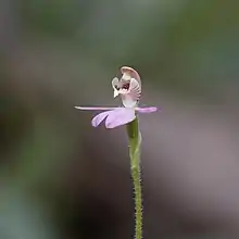 Caladenia pygmaea, is a terrestrial, perennial, deciduous, herb with an underground tuber and a single erect, sparsely hairy leaf, 20–30 mm long and 2–3 mm wide. A single flower 5–6 mm wide is borne on a spike 50–100 mm high. The sepals and petals are pale pink on the front and pale green and slightly hairy on the back. The dorsal sepal is 2.5–3 mm long, about 2 mm wide and curves forward forming a hood over the column. The lateral sepals and petals are about the same size as the dorsal sepal, with the petals spreading and the lateral sepals parallel to and often touching each other along their length. The labellum is about 3 mm long and 2 mm wide, pink or white with red bars. The sides of the labellum turn upwards and almost surround the column and the tip is a small yellow triangle with a few blunt teeth on its sides. Flowering occurs in October.[2]
