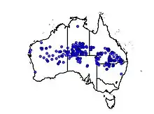 R. balonense is widely distributed in the arid and semi-arid zones of New South Wales, the Northern Territory, Queensland, South Australia, and Western Australia.[3][16] It is most common on sandplains, sand dunes and rises and along sandy intermittent watercourses. It is less frequently found on gravelly hills of neutral or acidic rocks.[2][6] The plant occurs in association with mulga and poplar box woodlands and in spinifex communities.[2][6]