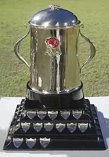 In the British Raj, Rugby union was introduced and emerged as second most popular winter sport after association football.[87][88] For the first time in the country, a scratch match or two played in Calcutta and Madras during the visit of MS Galatea in 1871.[89] At the ground of CC&FC, first recorded match was played, on Christmas Day.[90][91] The incident paved the way for growth of the British sport in India, and foundation of "Calcutta Rugby Football Club" in January the following year by expats, former students of Rugby School and soldiers of the Royal East Kent Regiment – which was stationed in the 1870s.[92][93][94] In 1874, Calcutta Football Club joined the Rugby Football Union (RFU).[94][95][96][97][98] After departure of British troops, and recreational facilities became disbanded, club's rugby section was discontinued in 1878.[99] Members decided to keep the memory of the club alive by having the remaining 270 silver rupee coins in their bank vault melted down to be made into a trophy (the Calcutta Cup), which was then presented to the Rugby Football Union (described as "the best means of doing some lasting good for the cause of Rugby Football").[99] The sport came back at the CC&FC in 1884. In 1890, an inter-club tournament was incepted by the CC&FC, named Calcutta Rugby Union Challenge Cup (known simply as Calcutta Cup),[34] and its second division trophy was clinched by the club. Later in 2007, they emerged as runners-up in that tournament.[100]