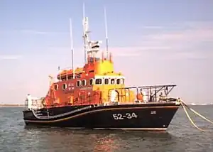 The second lifeboat at the station was the Brede-class lifeboat RNLB Safeway (ON 1104), which was moored just off Calshot Castle.[9][10] The crew used a davit-launched boarding boat when called out on service. Safeway, which was funded by and named for the Safeway supermarket chain, was built by Lochin Marine at Newhaven, East Sussex in 1985.[11] Like the Ernest William she had a fibreglass hull but was self-righting due to her watertight cabin.