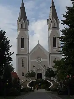 The Calvaria Church (Romanian: Biserica Calvaria; Hungarian: Kálvária templom) is a Roman Catholic religious building in Satu Mare, Romania, and one of the oldest churches in the city. Located on Mihai Eminescu Street, it was originally built in 1844, and stands in place of the old fortress Castrum-Zothmar. Its original walls broke after the foundation caved over the sandy ground. The church was rebuilt from the ground up by the Weszelovszky brothers, in 1908–1909. The church has a height of 42 metres (138 ft).[1]
