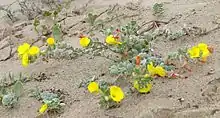 The beach suncup grows prostrate along the beach surface, forming mats more than 1 m across. It forms long stems growing from a central crown, lined with silvery grey-green leaves. The prostrate form and swinging stems allow the plant to survive well on the windy, shifting sands of the coast. The four-petalled flowers open in the morning (typical among suncups) and are bright yellow, fading to reddish.
