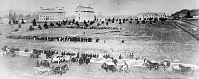 The campus opened in Eugene on October 16, 1876, in an 18-acre former wheat field purchased from Reverend J. H. D. Henderson. Henderson's land had been part of Hilyard Shaw's original donation land claim. Work on the first campus building, named Deady Hall in 1893, would not yet be completed until 1877, and school began on the building's first floor with hammering noise and other carpenter sounds coming from the floors above. Judge Joshua J. Walton, organizer of the Union University Association, the organization responsible for bringing the university to Eugene, kept his cattle on the property even after classes began. Judge Walton later erected a fence to separate his cattle from the students. The campus had no sidewalks, only two oak trees, and a great quantity of mud.[2][3]