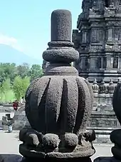 Ratna pinnacle took form of a curved obtuse pyramidal shape or sometimes cylindrical, completed with several base structure or pedestals took form as some ornamental seams (Javanese: pelipit). This form is known as keben pinnacle or the form of Barringtonia asiatica fruit.[22] It can be found as the pinnacle of both Hindu and Buddhist temples. Nevertheless, it is most prevalent in Hindu temples. The example of temple with ratna pinnacle is Sambisari and Ijo temple.