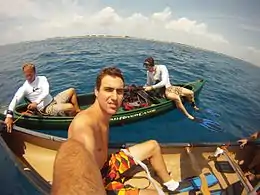 Getting into a kayak is the reverse of getting off. It is relatively easy to climb onto them from the side as the freeboard is low, but they are not very stable and are easy to capsize. The diver's weights are usually removed first and secured on the boat. Other loose equipment may be loaded at this stage. The scuba set is removed and clipped to a tether. Sufficient air to float the set must be in the buoyancy compensator. The fins are kept on the feet as they are used to boost the diver onto the kayak. Boarding is usually done by holding onto the kayak and using the fins to get roughly horizontal at right angles to the boat, then boosting over the kayak so that the hips are over the cockpit, face down, then rolling face up and sitting before swinging the legs onto the boat.[1]