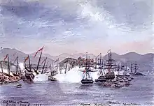After an hour, Chinese Admiral Zhang Chaofa and other officials accompanied the British on board the Wellesley.[5][9] The Chinese objected to being made answerable for actions at Canton, saying, "those are the people you should make war upon, and not upon us who never injured you; we see your strength, and know that opposition will be madness, but we must perform our duty if we fall in so doing."[10] They were informed that hostilities would commence if submission was not made before daylight the next day.[4] Their last words before departing at 8:00 pm were: "If you do not hear from us before sunrise, the consequences be upon our own heads."[10][11] Commodore Bremer wrote that "gongs and other warlike demonstrations were audible" throughout the evening.[11]
