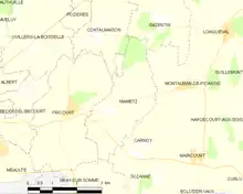 In 1914, Mametz was a village on the D 64 road, about 20 mi (32 km) north-east of Amiens and 4 mi (6.4 km) east of Albert. The village of Fricourt was to the west, Contalmaison to the north, Montauban to the north-east and Carnoy and Maricourt to the south-east. Mametz Wood was 1,000 yd (910 m) to the north-west and the village had about 120 houses and a station on the light railway from Albert to Péronne.[1] During the Race to the Sea, after the Great Retreat, the French 11th Division attacked eastwards north of the Somme but after the French territorials were forced back from Bapaume, the division was ordered to defend bridgeheads from Maricourt to Mametz.[2]
