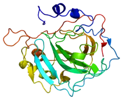 Carbonic anhydrase II (gene name CA2), is one of sixteen forms of human ฮฑ carbonic anhydrases.[5] Carbonic anhydrase catalyzes reversible hydration of carbon dioxide. Defects in this enzyme are associated with osteopetrosis and renal tubular acidosis. Renal carbonic anhydrase allows the reabsorption of bicarbonate ions in the proximal tubule. [6] Loss of carbonic anhydrase activity in bones impairs the ability of osteoclasts to promote bone resorption, leading to osteopetrosis.[7]