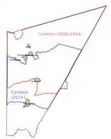 The electoral districts of Carleton (2006-2014) and Carleton (2014-) as they relate to Carleton County and its municipalities.