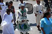 The Zacapoaxtlas stand out because they have the most elaborate and costly costumes. They dress as charros, which suits heavily decorated in sequins, a wig with the colors of the Mexican flag and a black cape.[6] Representing the troops of General Zaragoza in the Battle of Puebla, they wear green, white and red paper streamers that hang off the back of their hats. Their suits are elaborated embroidered and sequined which has been hand done.[2] These outfits have been valued at about 30,000 and sometimes as high as 50,000 pesos.[9]