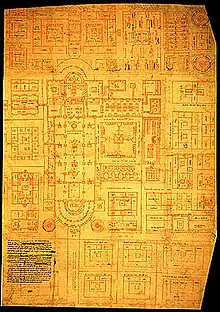 The plan of Saint Gall is an architectural drawing of a monastic compound created between 820–830CE.[38] It features, churches, houses, stables, kitchens, workshops, brewery, infirmary, and a place for bloodletting. The complex was apparently meant to house about 110 monks, 115 lay visitors, and 150 craftsmen and agricultural workers.[39] Despite never having been built it can inform historians to what the "ideal" Carolingian Benedictine monastic community might have looked like. It is possible to see the Benedictine Rule being applied in the architectural design. One of the major aspects of the rule of St Benedict is the removal from worldly life and a dedication to prayer, meditation and study. This required that the planned monastery would be self sufficient. Accordingly, the Plan features 40 ground plans which not only feature the monastic buildings (basilica, cloister, abbot's house and cemetery) but also secular buildings for the use of lay workers and visitors.[40]