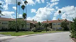 Built in 1926, the Casa Caprona (also known as the Markert Apartments) is a historic building in Fort Pierce, Florida, USA.[2] It is located at 2605 St. Lucie Boulevard. The complex was designed in the Mediterranean Revival style by architects Arthur Beck and J.K. Shinn, and was built by T.H. Markenthaler and T.H. Kertshner.[3] For a period of time the complex housed people training in the Navy's underwater demolition group during WWII.[4] The complex was envisioned as the centerpiece for the proposed winter community of San Lucie Plaza. However, due to the collapse of the Florida land boom, the project failed.[2]