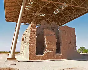 "Casa Grande" is Spanish for "big house" (Siwañ Wa'a Ki: in O'odham); these names refer to the largest structure on the site, which is what remains of a four-story structure that may have been abandoned by 1450. The structure is made of caliche, and has managed to survive the extreme weather conditions for about seven centuries. The large house consists of outer rooms surrounding an inner structure. The outer rooms are all three stories high, while the inner structure is four stories high. The structures were constructed using traditional adobe processes. The wet adobe is thicker at the base and adds significant strength. Noticeable horizontal cracks define the breaks between courses on the thick outer walls.[7] The process consisted of using damp adobe to form the walls and then waiting for it to dry, and then building it up with more adobe. Casa Grande contained a ball court much like that found at Pueblo Grande de Nevada. Father Eusebio Kino was the first European to view the Hohokam complex in November 1694 and named it Casa Grande.[8] Graffiti from 19th-century passers-by is scratched into its walls; though this is now illegal. Casa Grande now has a distinctive modern roof covering built in 1932.