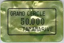 European casinos use a similar scheme, though certain venues, such as the Aviation Club de France, use pink for €2 and blue for €10. European casinos also use plaques rather than chips for high denominations, usually in the €1000 and higher range.