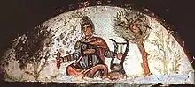 The fourth-century catacomb of Marcellinus and Peter contains a mixture of pagan and Christian imagery (both old and new testament).[3] One room located within the catacomb, labeled as room 79, depicts imagery that demonstrates this mixture. A few of the images are Peter striking water from a rock, Orpheus playing a lyre, the raising of Lazarus, and Daniel in the lion's den. Another room within the catacomb, room 66, contains paintings of athletes.[3]
