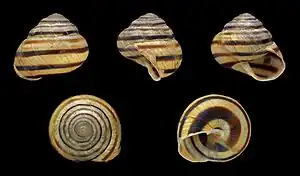 The right-hand coiled, globular shell of C. vindobonensis is 17–21 mm high and 20–25 mm broad with 5.5–6 whorls.[6] In adults, the umbilicus is completely covered. The lip is brown at its inner end becoming pale towards the suture; this distinguishes it from the conchological similar Cepaea hortensis (usually pure white lip) and Cepaea nemoralis (usually a dark brown lip), with which C. vindobonensis often co-occurs. Another difference is that the shell C. vindobonensis has fine growth ridges whereas those of Cepaea are smooth.[7] The shell is whitish or yellowish, with typically 5 brown stripes, of which the upper two are usually weak. The lowermost stripe is nearer to the columella than in Cepaea.[8] There is a slight variation of shell colour within this species (see below). The animal itself is yellowish with grey tentacles.