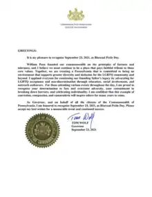 In 2021, Pennsylvania governor Tom Wolf became the first governor in the United States to issue a statement recognizing Bisexual Pride Day.[13]