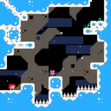 Due to the gameplay requiring more precise control, the developers chose not to use a pre-existing physics engine, as opting for proprietary physics simulations allowed them to predetermine outcomes for certain situations rather than rely on complex simulations of certain engines.[38] The precise gameplay also influenced the art style, as the team felt that pixel art could more clearly convey mechanics such as hitboxes to the player, and was a style that the team was familiar with creating.[39] As the team adjusted Madeline's attributes, levels were frequently redesigned to accommodate them.[40]