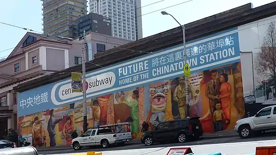 Temporary artworks were also installed during construction. "One Hundred Years: History of the Chinese in America", a mural painted by James Leong originally for the Ping Yuen housing project in Chinatown, was enlarged, printed, and wrapped in 2012 around the Hogan & Vest building at Stockton & Washington, at the future Chinatown station site, prior to that building's demolition.[90] In addition, temporary murals were painted on the construction barricades erected around the Chinatown and Yerba Buena/Moscone stations.[91] The art was printed on adhesive vinyl and wrapped onto the plywood panels, measuring approximately 8 ft (2.4 m) high by 190 ft (58 m) long at Chinatown, along Stockton, or 160 ft (49 m) long at Yerba Buena/Moscone, along Folsom.[92] Temporary art was also installed around the Pagoda Palace Theatre from 2014 to 2017, while it was being used to extract the two tunnel boring machines.[93]