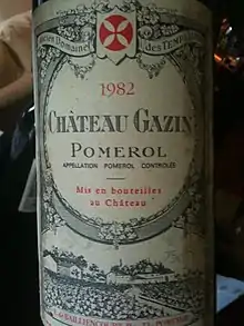 Château Gazin is a Bordeaux wine from the appellation Pomerol. The winery is located on the Right Bank of the Bordeaux wine region, in the commune of Pomerol in the department Gironde. As all wine produced in this appellation, Château Gazin is unclassified, but the estate has since the 1840s been estimated among the great growths of Pomerol.[1][2]