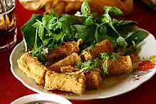 Chả giò (Vietnamese: [ca᷉ː jɔ̂]), or nem rán, also known as fried spring roll, is a popular dish in Vietnamese cuisine and usually served as an appetizer in Europe, North America & Australia, where there are large Vietnamese diaspora. It is ground meat, usually pork, wrapped in rice paper and deep-fried.[1][2]