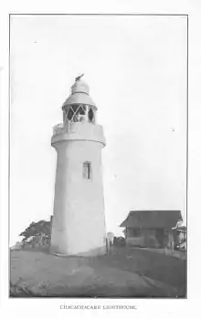 Chacachacare Lighthouse was an active lighthouse located in the north part of Chacachacare atop a hill at an elevation of 236 metres (774 ft). The tower was built in 1897 in masonry with a cylindrical shape with balcony and lantern which is positioned at a height of 251 metres (823 ft) above sea level. The tower is painted white and has a height of 15 metres (49 ft), the lantern is painted red. While the lighthouse was active, it emitted one white flash in a ten seconds period visible up to 26 nautical miles (48 km; 30 mi).