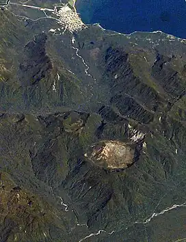 The caldera rim reaches 1,122 metres (3,681 ft) above sea level. Before the current eruption, it was mostly filled by a rhyolite obsidian lava dome that reached a height of 962 metres (3,156 ft), partly devoid of vegetation. Two small lakes occupied the caldera floor on the west and north sides of the lava dome.[1]