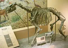 Chalicotheriidae (from Greek chalix, "gravel" and therion, "beast") is an extinct family of herbivorous, odd-toed ungulate (perissodactyl) mammals that lived in North America, Eurasia, and Africa from the Middle Eocene until the Early Pleistocene, existing from 48.6 to 1.806 mya. They are often called chalicotheres, a term which is also applied to the broader grouping of Chalicotherioidea.[4] They are noted for their unusual morphology compared to other ungulates, such as their elongated clawed forelimbs.[5] They are thought to have been browsers.[4]