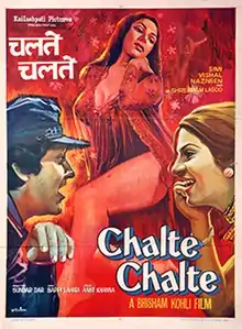 Chalte Chalte (transl.On the Way) is a 1976 Indian Hindi-language musical romantic thriller film directed by Sunder Dar and produced by Bhisham Kohli.[2] It stars Vishal Anand (Bhisham Kohli's screen name) and Simi Garewal in pivotal roles. The film was noted for its songs by Bappi Lahiri, and title song, "Chalte Chalte" sung by Kishore Kumar was part of the Binaca Geetmala annual list 1976.[3] It was a superhit at the box office.