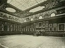 As designed, the main entrance to the upper levels opened into a large vestibule, which in turn led to a double-height hall measuring 20 by 80 feet (6.1 by 24.4 m). This hall was made of Caen stone and marble. The building's elevators, as well as a stair to the second-floor Great Hall, were placed at the end of this hall.[10][17][23] The design of the stair was inspired by the Ducal Palace in Venice and led to the second-story main room and elevator hall.[11][12] The decoration of the hall's upper half was extremely elaborate. Colored-marble Ionic columns supported a frieze, above which rose a domed ceiling. Between each set of columns, there were tablets that were inscribed with the names of the Chamber of Commerce's officers. At the time of the building's construction, the tablets accommodated names of past officers and could be inscribed with the names of future officers.[23] The rest of the ground floor was rented out as a banking room, the only commercial concern in the building.[10][9][18]