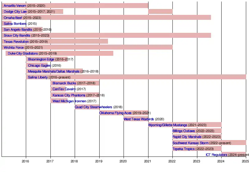 - Oklahoma Flying Aces (Enid, Oklahoma) – Played in CIF beginning in 2019 but suspended operations prior to 2021 season. Team assets were subsequently sold in 2022.