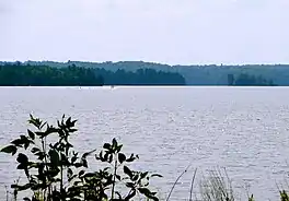 The lake is in the shape of a reversed L, with three main bays: West Bay, connected to the main body of the lake by a long Narrows; South Bay, extending southwest and separated by a curved peninsula; and Gilmour Bay, a smaller, two-lobed bay on the southern tip of the lake, connected by Gilmour Bay Narrows.