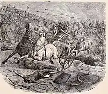 The best known and preserved textual evidence about Egyptian chariots in action was from the Battle of Kadesh during the reign of Ramses II, which was probably the largest single chariot battle in history.[9] Kamose (1555–1550) has the distinction of being the first Egyptian ruler to use the chariot and cavalry units in battle, giving him victory. Accounts reveal that the Hyksos, who were lording over the northern territories in his reign, were startled when Egyptian chariots started to roll in the battlefield at Nefrusy, north of Cusae (near modern Asyut).[10] The chariots were improved versions of what they used to terrorize the enemy.[11][10]