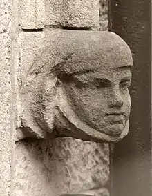 The building incorporates almost 300 pieces of 12th century sculpture.[1] "Care was taken to reuse and preserve as much of the original sculptural decoration as possible, generally with original sculpture reused internally with new sculpture employed externally." There are fifteen carved panels around the doorjambs of the south porch; five of these are mediaeval; the rest are "high quality Victorian reproductions" by Mawer. Regarding the inner porch doorway: seven of the doorjamb stones are mediaeval, and five are by Mawer. The chancel arch, in imitation of an original voussoir found in a wall, is by Mawer. Of the eight capitals supporting the arch, six are original and two are "high quality" works by Mawer.[20] Charles "executed fine neo-Romanesque carving" to replace or repair stones in the restoration of this building.[1][25] "The font at the west end is of Caen stone, on alabaster shafts and capitals. It is the work of Mr C. Mawer, of Leeds,"[22] and carved "in a rather elaborate Norman style."[21]
