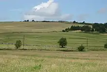 An amphitheatre stood west of the settlement.[12] It is the only one in England to exist at a lead mine and is additional evidence of the importance of Mendip lead to the Romans.[13] It measures 32m x 24.4m and the banks for the seating survive 4.5m above the arena. It was surveyed in 1909. It was probably a place of entertainment for the soldiers at the Roman fort which was established here.[14]