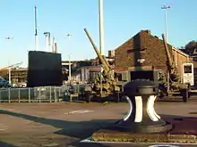 HMS Ocelot on display, with an anti-aircraft gun to the right as part of a display on the Dockyard and the V1 rocket.