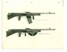 The design of the Chauchat dates back to 1903, and its long recoil operation is based on the John Browning-designed Remington Model 8 semi-automatic rifle of 1906, not (as so often repeated in the past) on the later designs (1910) of Rudolf Frommer, the Hungarian inventor of the commercial Frommer Stop pistol.[5] The Chauchat machine rifle project was initiated between 1903 and 1910 in a French Army weapon research facility located near Paris: Atelier de Construction de Puteaux (APX). This development was aiming at creating a very light, portable automatic weapon served by one man only,[6] yet firing the 8 mm Lebel service ammunition. The project was led from the beginning by Colonel Louis Chauchat, a graduate from Ecole Polytechnique, assisted by senior armorer Charles Sutter. Not less than eight trial prototypes were tested at APX, between 1903 and 1909. As a result, a small series (100 guns) of 8 mm Lebel CS (Chauchat-Sutter) machine rifles was ordered in 1911, then manufactured between 1913 and 1914 by Manufacture d'armes de Saint-Étienne (MAS). Because they were light, they were used temporarily during the early part of World War I to arm observation crews on French military aircraft.[7] Only one CS machine rifle is known to have survived in a Prague museum.[8]