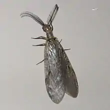 Fishflies are members of the subfamily Chauliodinae, belonging to the megalopteran family Corydalidae.[1] They are most easily distinguished from their closest relatives, dobsonflies, by the jaws (mandibles) and antennae. In contrast to the large jaws (especially in males) of dobsonflies, fishfly mandibles are not particularly noticeable or distinctive, and the males have feathery antennae similar to many large moths. Chauliodes pectinicornis, the "summer fishfly", is a well-known species in North America.
