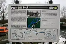 Much of the maintenance is carried out by local volunteers as well as volunteers from Waterway Recovery Group, which is also part of the IWA.[28] Regular working parties help to keep the waterway, including the towpath, locks and other structures well maintained, and many of the recent improvements have been undertaken by the volunteers.[29] In February 2016, the two groups worked together to upgrade 700 yards (640 m) of towpath near Papermill Lock, where a section of muddy towpath was given an all-weather surface by using 150 tons of road planings. The material was donated by Essex Highways, after it had been removed from roads during resurfacing work.[30]