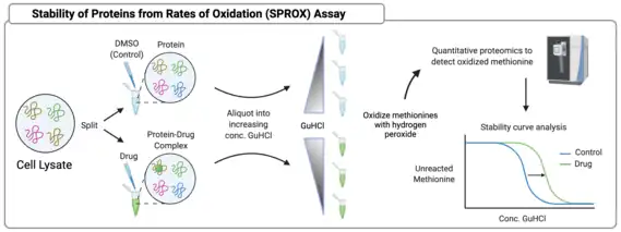 Stability of Proteins from Rates of Oxidation also rests upon the assumption that ligand binding confers protection to proteins from manners of degradation, this time from oxidation of methionine residues. In SPROX, a lysate is split and treated with drug or a DMSO control, then each group is further aliquoted into separate samples with increasing concentrations of the chaotrope and denaturant guanidinium hydrochloride (GuHCl). Depending on the concentration of GuHCl, proteins will unfold to varying degrees. Each sample is then reacted with hydrogen peroxide, which oxidizes methionine residues. Proteins that are stabilized by the drug will remain folded at higher concentrations of GuHCl and will experience less methionine oxidation. Oxidized methionine residues can be quantified via LC-MS/MS and used to generate methionine stability curves, which are a proxy for drug binding. There are drawbacks to the SPROX assay, namely that the only relevant peptides from SPROX samples are those with methionine residues, which account for approximately one-third of peptides, and for which there are currently no viable enrichment techniques. Only those methionines that are exposed to oxidation provide meaningful information, and not all differences in methionine oxidation are consistent with protein stabilization. Without enrichment, LC-MS/MS analysis of these peptides is challenging, as the contribution of other sample components to mass spectrometer noise can drown out relevant signal. Therefore, SPROX samples require fractionation to concentrate peptides of interest prior to LC-MS/MS analysis.[16]