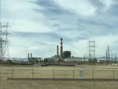 Cherokee Generating Station is a natural gas-fired power plant in Adams County, Colorado, about 5 miles (8.0 kilometers) north of downtown Denver.[1] Cherokee currently has a nameplate capacity of 1006.4 megawatts, and a net summer capacity of 886 megawatts,[2] making it the largest power plant in Adams County, and the second largest natural-gas fired plant in the state behind Fort St. Vrain Generating Station.[3] In 2022, Cherokee output a total of 3.2 billion kilowatt-hours of electricity, representing roughly 5 percent of total electricity generation in Colorado.[4] Cherokee is composed of four power generating units: one standalone natural gas fired steam turbine, two natural gas fired combustion turbines, and one steam turbine sourcing its heat from the exhaust of the two combustion turbines. This configuration (excluding the independent standalone steam turbine) is known as a combined cycle natural gas power plant. In 2022, the overall thermal efficiency of the steam turbine unit was 31.3%, compared to 43.2% of the combined cycle units.[4] Efforts have been made to reduce the amount of water consumed, most likely from evaporation in the cooling towers.[5] The combined cycle units were constructed in 2015, adding another 625.6 megawatts of nameplate capacity to the steam turbine's 380.8 MW.[6] Prior to 2017, the steam turbine unit was almost entirely powered by coal, however it made the shift to only natural gas that year, and has not burned coal since.[4] The change was partly due to the Clean Air Act of 2010, which had the focus of reducing emissions from coal power plants, however other factors such as the inexpensive price of natural gas and pressure for the state to transition away from coal also played parts.[6][7]