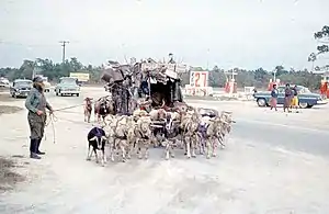 McCartney's iron-wheeled wagon was large, rickety, and garishly decorated with a clutter of objects he found and collected along the road. It contained a bed, a potbellied stove, lanterns, and lots of trash, and was pulled by a team of around nine goats, with a few trailing behind to occasionally push and serve as brakes on downhill stretches of road. His traveling goat herd sometimes numbered up to thirty. The goats were surprisingly sturdy and effective draft animals and McCartney managed to make five to ten miles a day, even pushing up Tennessee's Monteagle Mountain during a winter storm that stalled all other vehicle traffic. He claimed to have survived that cold night by pulling a couple of extra goats into the wagon with him.